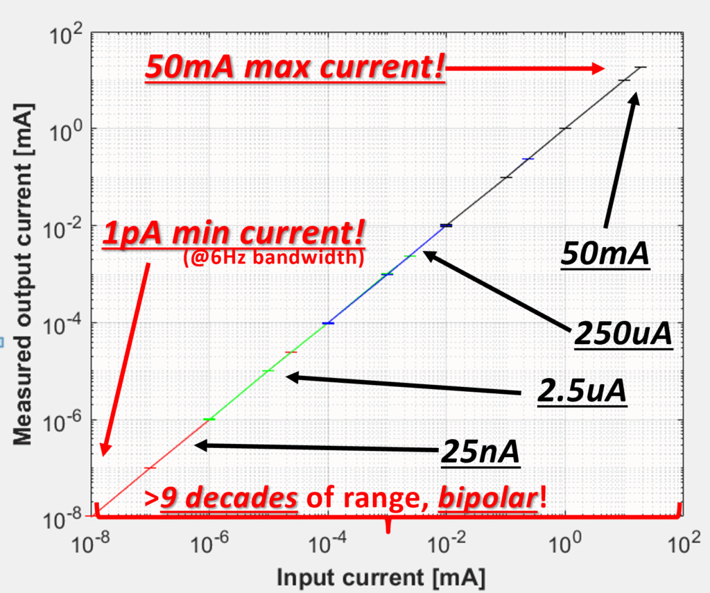 | Current Resolution LSB (R0–R1–R2–R3) | RANGE0: 6 nA RANGE1: 30 pA RANGE2: 300 fA RANGE3: 3 fA |